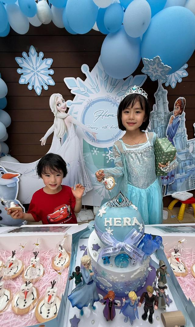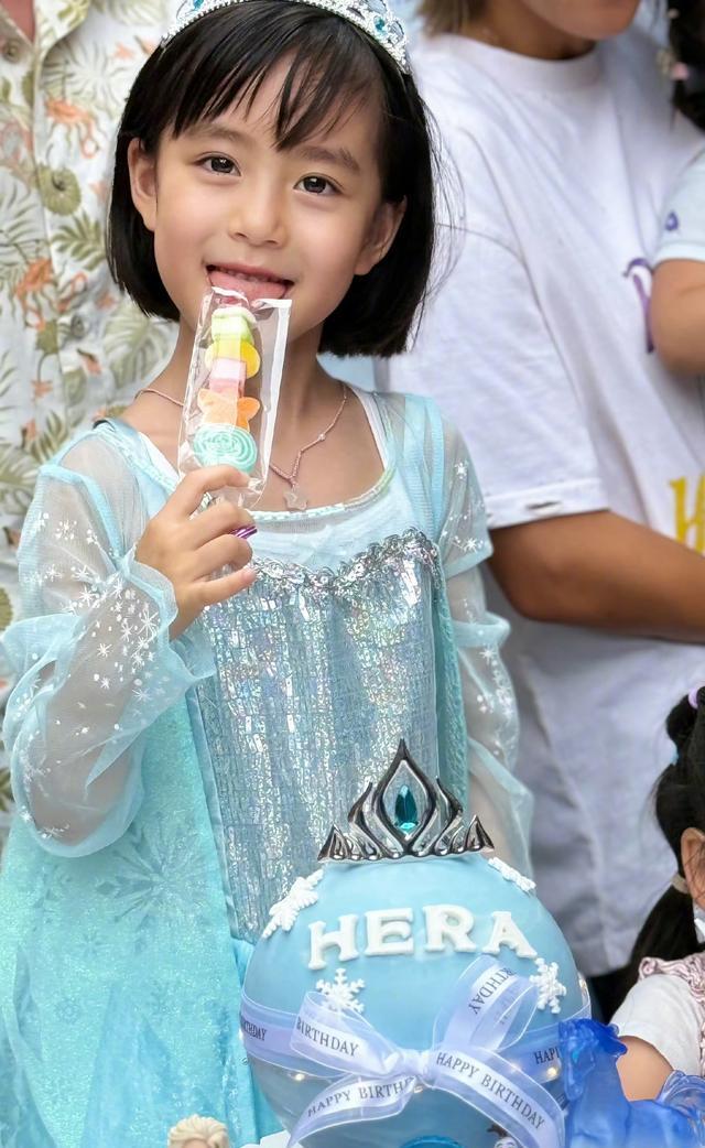 显然小珍珠面前桌子上的蛋糕也是非常吸睛的,想必是妈妈杨茜尧特地定制的,为了给小寿星一个惊喜。