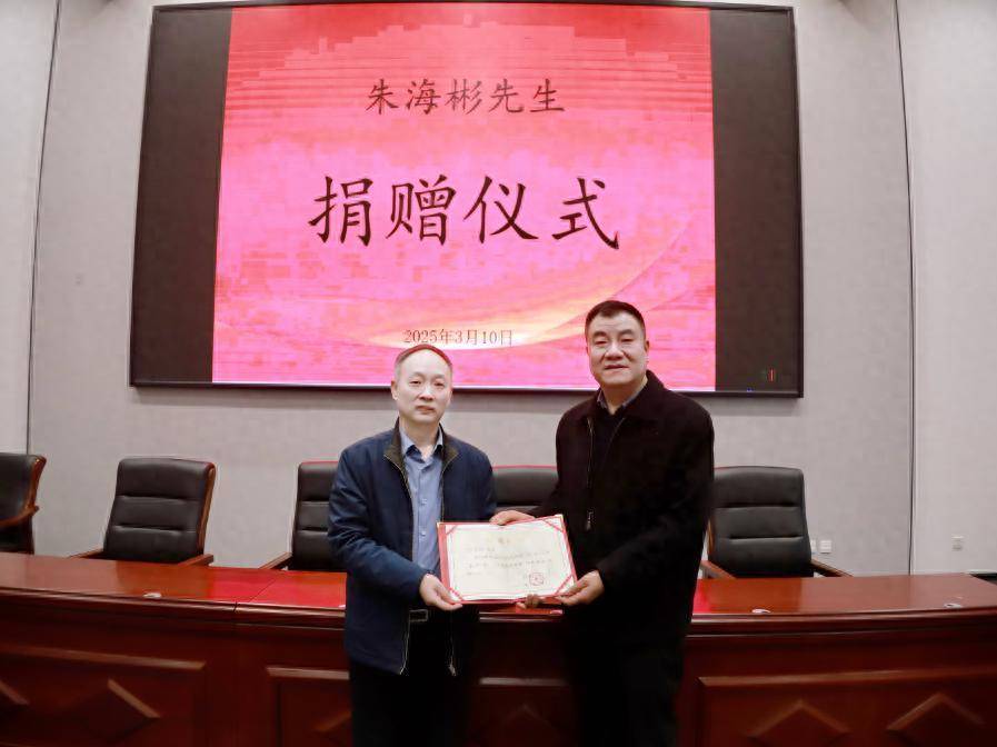 近日,朱海彬先生捐赠文物仪式在开封市博物馆举行。开封市博物馆党支部书记汤庆波向朱海彬先生颁发收藏证书,对其以实际行动表达对开封市博物馆文物工作与事业的关心与支持表示感谢。开封市文化广电和旅游局党组成员、副局长李金国出席捐赠仪式。